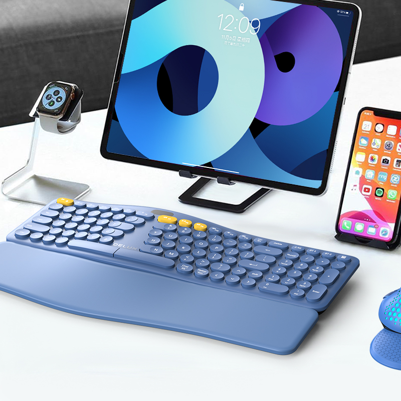 科技的日益发展,各大企业都实现了现代化的办公,从前使用纸笔记录,工作效率低下,而现在,在键盘上敲敲打打,一篇稿件即可完工;使用鼠标和键盘同时开工,设计图随心定。而且通过线上各种软件,来自世界各地的企业也可以架起沟通的桥梁,去链接了更大的世界。 线上办公带来的全都是优点吗?实际却不然。很多时候,白领一族都要面对长时间电脑办公,不知不觉,倏忽间眼睛容易花、脊背也容易驮着,甚至连长时间打字的双手,容易变得疲软无力。为了让办公体验更舒适,现如今,市面上推出很多人体工学的配件,那首要给大家推荐的键盘即是多彩GM902人体工程学键盘。 健康办公,精致生活,从多彩科技开始。拒绝肩膀酸痛、手臂僵硬、手腕酸痛等诸多身体不适烦恼。该键盘经多彩专业研发团队认证,尤其适合IT行业从业者、金融、财务等公司白领或者是公职公务人员使用,患有鼠标手、电脑颈、办公肩的用户同样适用。 多彩键盘作为专业的人体工学产品,有了它,可让办公更轻松,产品依据手腕自然垂落的姿势进行按键布局,键面弧度模拟指尖的弯曲形状,字符可以轻松敲击触发。基于柔软掌托设计,它也能让手腕时刻停留在舒适的位置,让手臂自然伸展开来。 不可多得的办公好搭档,产品以2.4G+蓝牙双通道无线连接,迅捷稳定,同样方便携带,支持Windows、Mac、Android、IOS系统,为用户创造无限可能。这款键盘适合在商务会议时使用,一触自如,同时连接三台设备,随时自由切换。 GM902人体工程学键盘,具有三种角度可以调节。在前脚架撑起之后,键盘后端可以和桌面形成5度的角度;前后脚架同时撑起之后,键盘后端和桌面可以形成1.5度夹角,适用于上身高于桌面身体前倾时使用;前后脚架同时撑起后,键盘后端和桌面形成1.5度夹角,适用于上身高于桌面身体前倾时使用。 有很多人用户认为专门购买一个键盘有些画蛇添足,案例可知,为什么玩游戏的时候,职业选手会推荐你使用电竞椅?闻道有先后,术业有专攻,好的装备,总能为您加持美好充沛向上的积极能量,无论是工作亦或是游戏,选择头脑风暴或是驰骋沙场,都需要一个合适的好物工具。若你也是一个长时间面对着电脑的办公族,办公压力大,经常要加班,还不幸患有鼠标手、电脑颈或者办公肩,GM902实为首选之物,丰富您的办公桌面,为美好品质生活附加能量。 关注【DELUX多彩科技】了解更多新品资讯